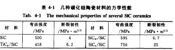 ⑤制備工藝的簡化。幾種碳化硅陶瓷材料的力學性能見表4-1。