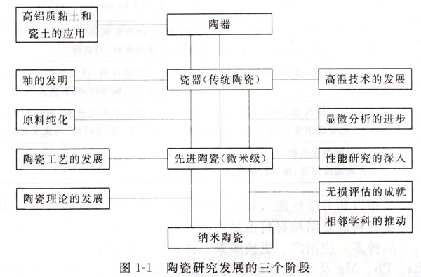 總的來說,陶瓷是一種既古老而又年輕的_:程材料,陶瓷材料的發展經歷了從陶瓷發曩裂瓷器.從傳統陶瓷發展到先進陶瓷,從先進陶瓷發展到納米陶瓷三次重大飛躍(見圖I-I),而這三次飛躍只是中華文明史的一個縮影。